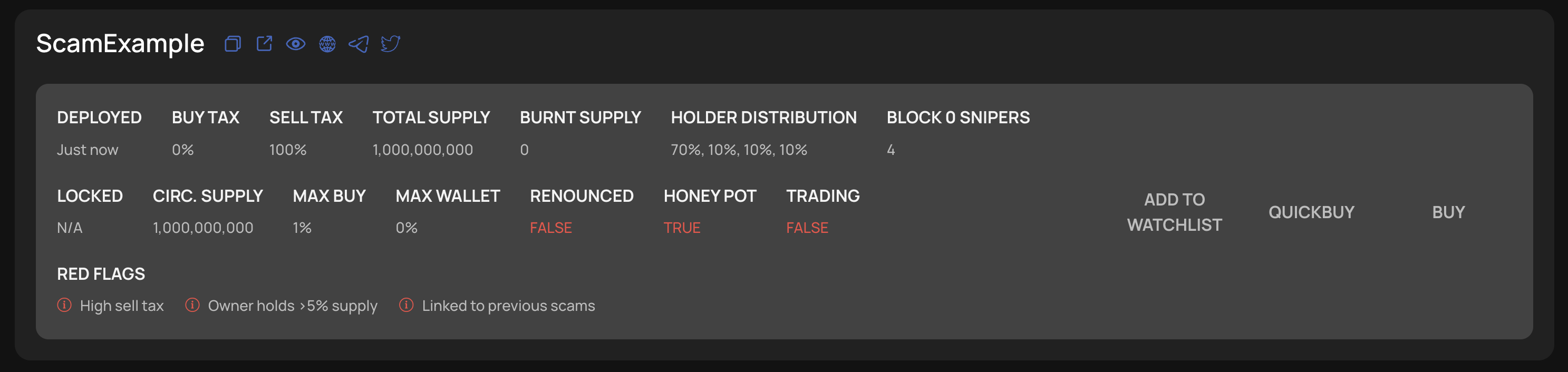 As you can see, renouncing = false + honeypot = true which are red flags and therefore highlighted in red. Although trading = false and is highlighted in red, this is not necessarily a red flag as a project could have simply not enabled trading yet!