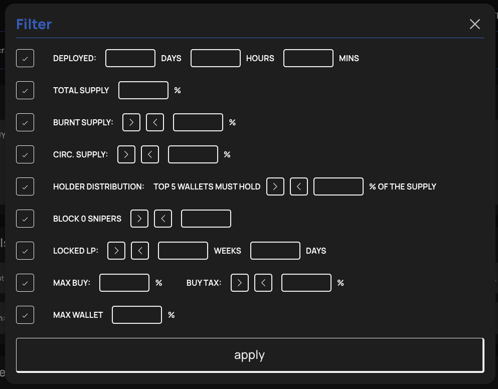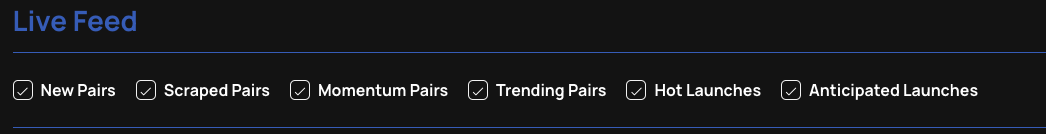 Users are able to **extensively** filter their Live Feed to best fit their interests and risk tolerance; only projects that fit their filters will appear in their Live Feed (for both newly deployed coins and scraped pairs)