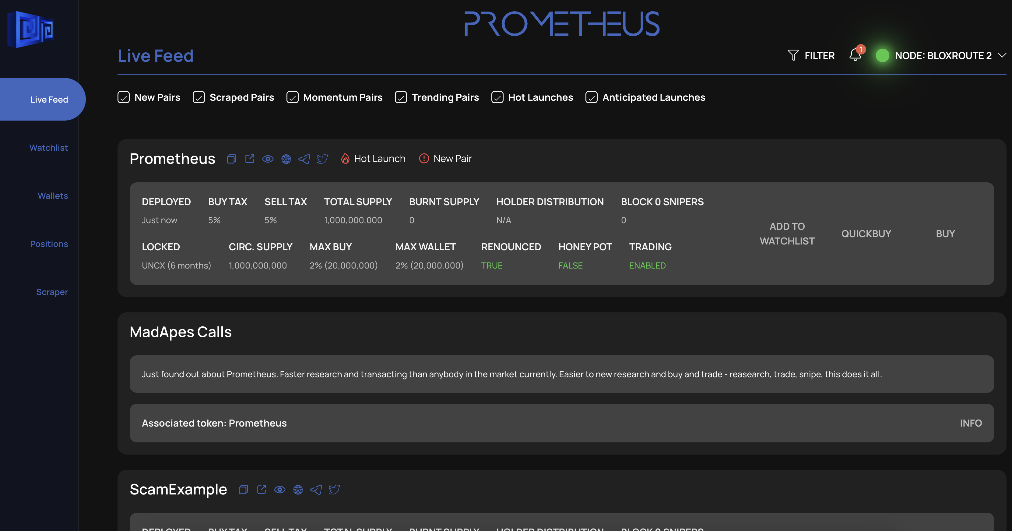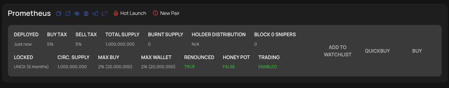 The Live Feed also tags each coin with premade filters (Hot Launch and New Pair in this case) for quicker researching, decision-making, and easily-digestible knowledge for the user!